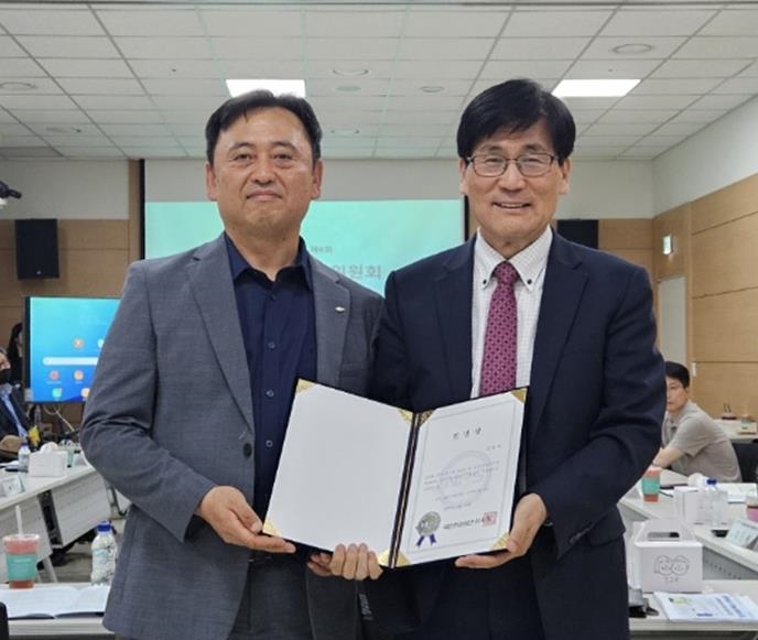 국민연금장애인지원실 채우석 실장(왼쪽)과 한국사회복지정책연구원장 김종인 교수(오른쪽)가 임명장 수여식에서 포즈를 취하고 있다.